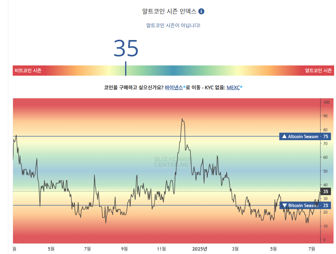 | 0~25 | 비트코인 시즌 | 비트코인이 시장 주도, 알트코인 상대 약세 |