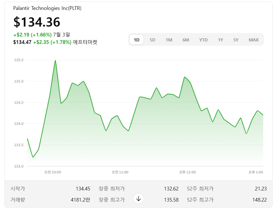 2025년 7월 기준, 주가는 $134~137 수준이며, 상장 이후 1340% 상승, 2024년 한 해에만 340% 상승, 2025년 상반기에도 81% 상승했습니다.